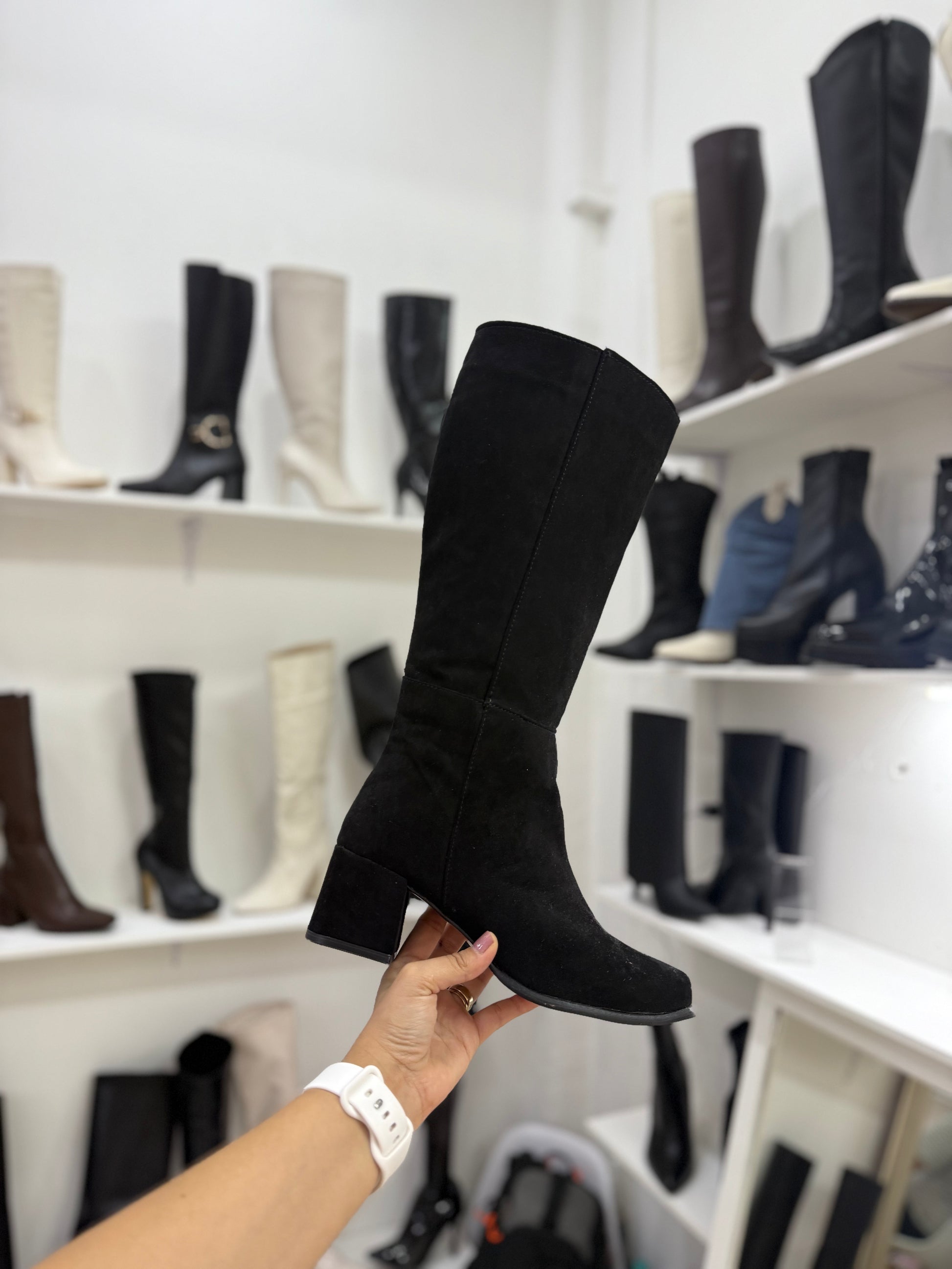 bota larga de tacon bajito cuadrado de material tipo terciopelo